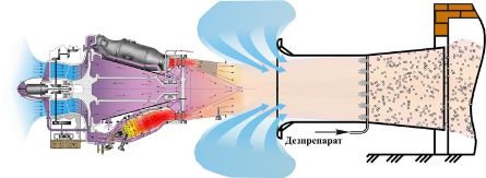 Дезинфекционная среда формируется с помощью распыла дез. раствора против потока выходящей струи газа через 2 форсунки с 260 отверстиями