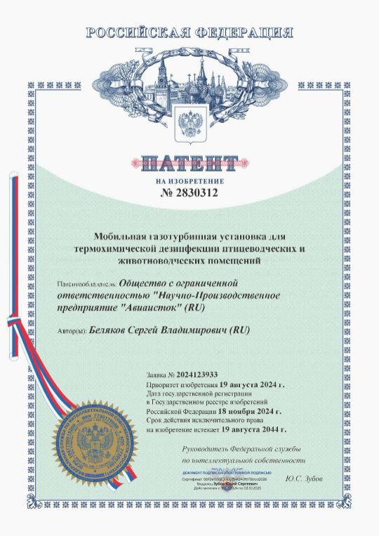 НПП "Авиаисток" получило Патент на изобретение мобильной газотурбинной установки для термохимической дезинфекции птицеводческих и животноводческих помещений.